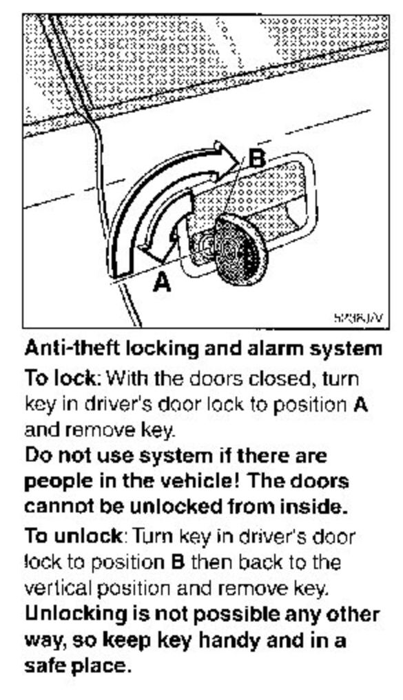 According to Haynes, early model connections between the central locking system and the factory alarm K94 are made via three wires; black/red goes to K37 Pin 8 (+12V unlock pulse), brown/white goes to boot lock switch and black/blue goes to the changeover contact on the drivers lock microswitch S41. Am I right in thinking that this particular connection pulses to 12V when the deadlock is engaged and the doors get the lock pulse? It's been so long since I de-locked the car I can't recall how S41 was operated by the key. Does it remain in the Normaly open position when the key is turned and left in position A?: