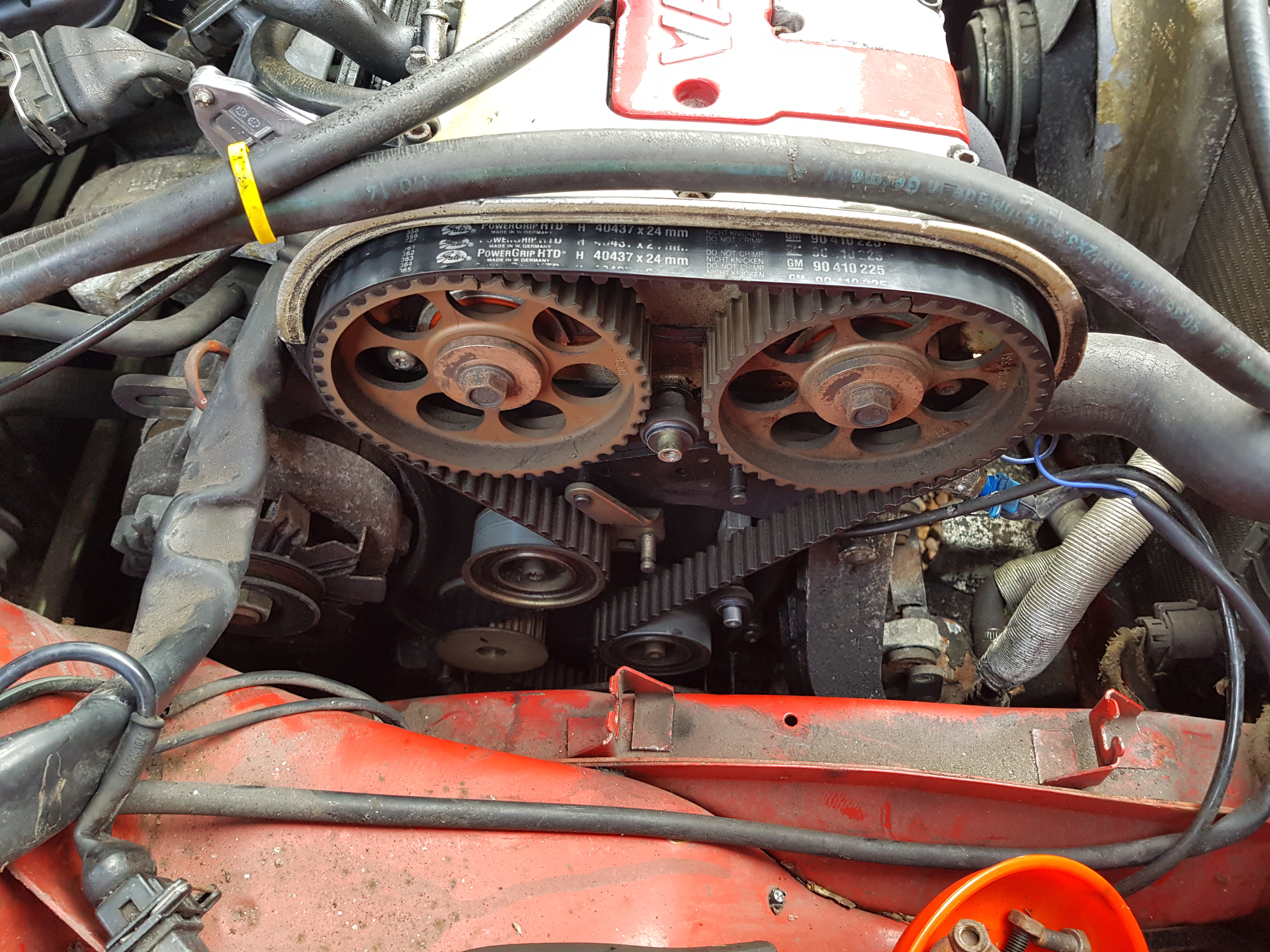 And with a fresh ticket there she sat for a month until I gathered some parts , time and , money . Sorted the heater which didn't work at all ( resistor ) and run it up as much as I could to get decent fuel through it I then proceeded to change the cambelt kit . Water pump . Thermostat and the aux belts aswell